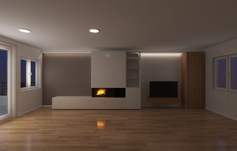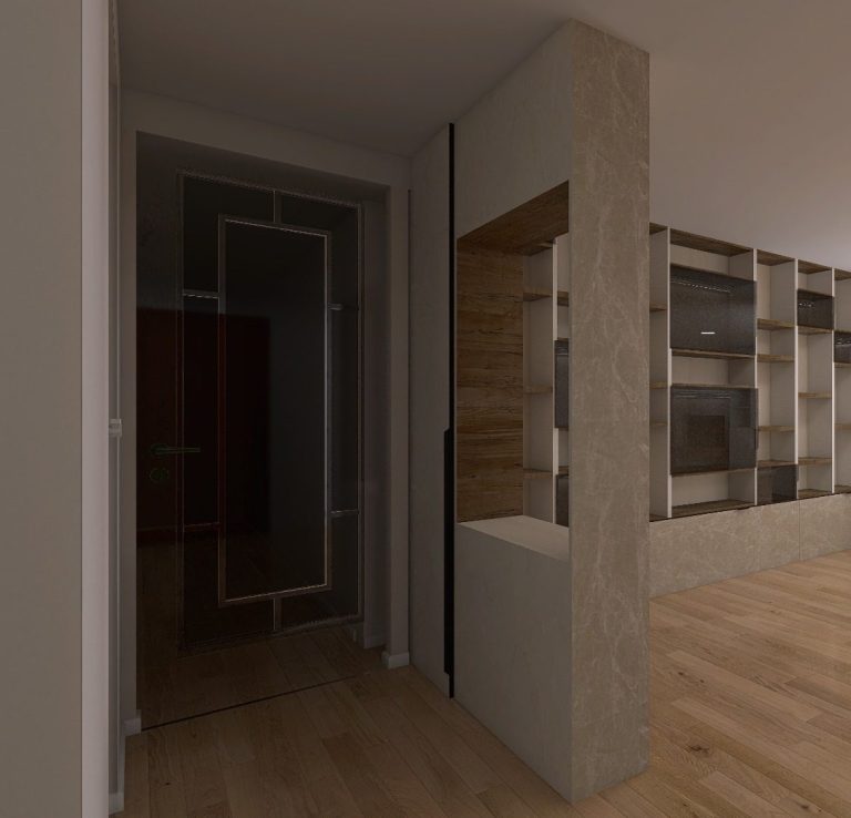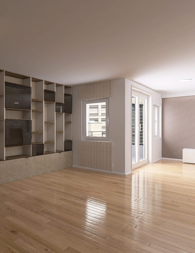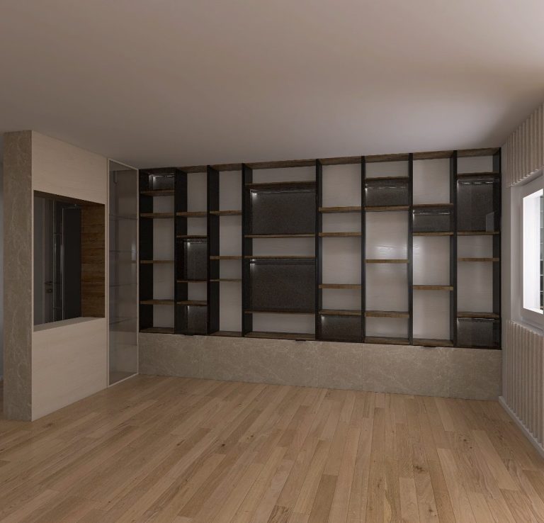 El proyecto propone un espacio residencial de estilo moderno y minimalista, concebido bajo una premisa de elegancia, funcionalidad y armonía visual. La composición interior se organiza en torno a una paleta de tonos neutros y materiales naturales, como la madera clara y la piedra, que aportan calidez y equilibrio al ambiente. En contraste, una de las paredes laterales se transforma en una biblioteca modular con estructura metálica y repisas de madera, que combina rasgos industriales y contemporáneos. Este elemento funcional introduce ritmo y dinamismo al conjunto, además de ofrecer soluciones prácticas de almacenamiento y exhibición.