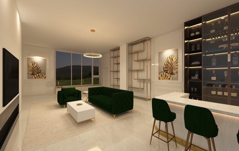 El proyecto propone un espacio residencial de estilo moderno y minimalista, concebido bajo una premisa de elegancia, funcionalidad y armonía visual. La composición interior se organiza en torno a una paleta de tonos neutros y materiales naturales, como la madera clara y la piedra, que aportan calidez y equilibrio al ambiente. En contraste, una de las paredes laterales se transforma en una biblioteca modular con estructura metálica y repisas de madera, que combina rasgos industriales y contemporáneos. Este elemento funcional introduce ritmo y dinamismo al conjunto, además de ofrecer soluciones prácticas de almacenamiento y exhibición.